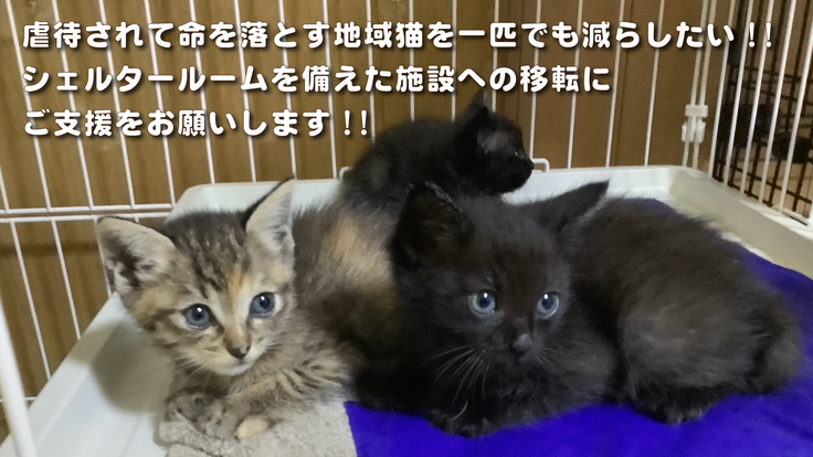 現在のワンルームアパートから施設を移転し、シェルタールームを備えて、猫エイズや白血病、出産を控えた地域猫など、より多くの地域猫を保護できる施設に移転します。