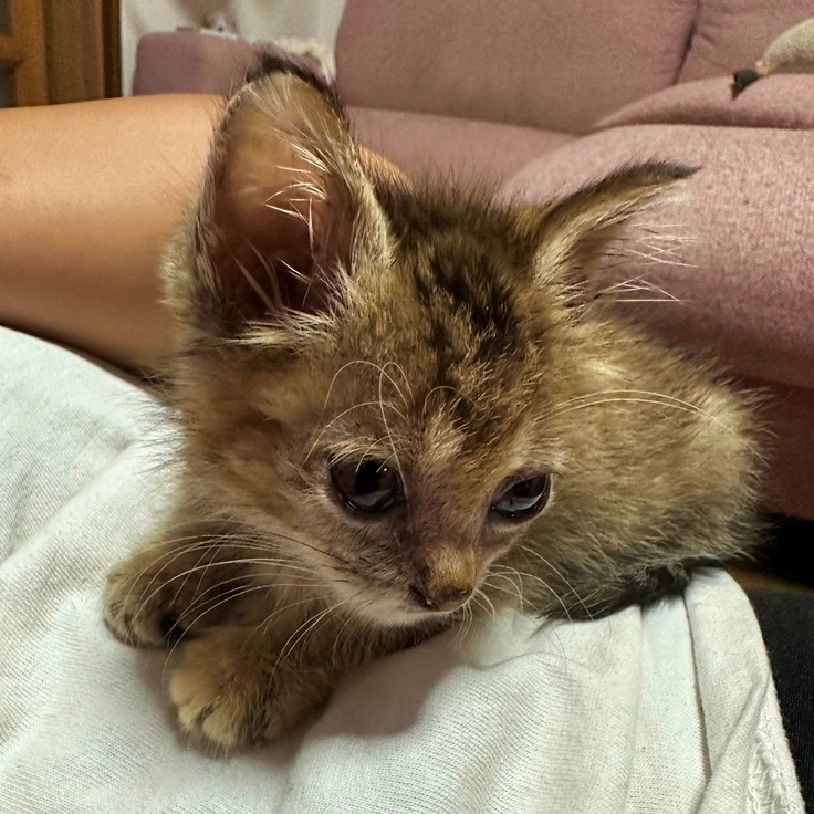 行ってみると重量が感じられない程の小さな赤ちゃん猫が座布団にジッと座っていました。