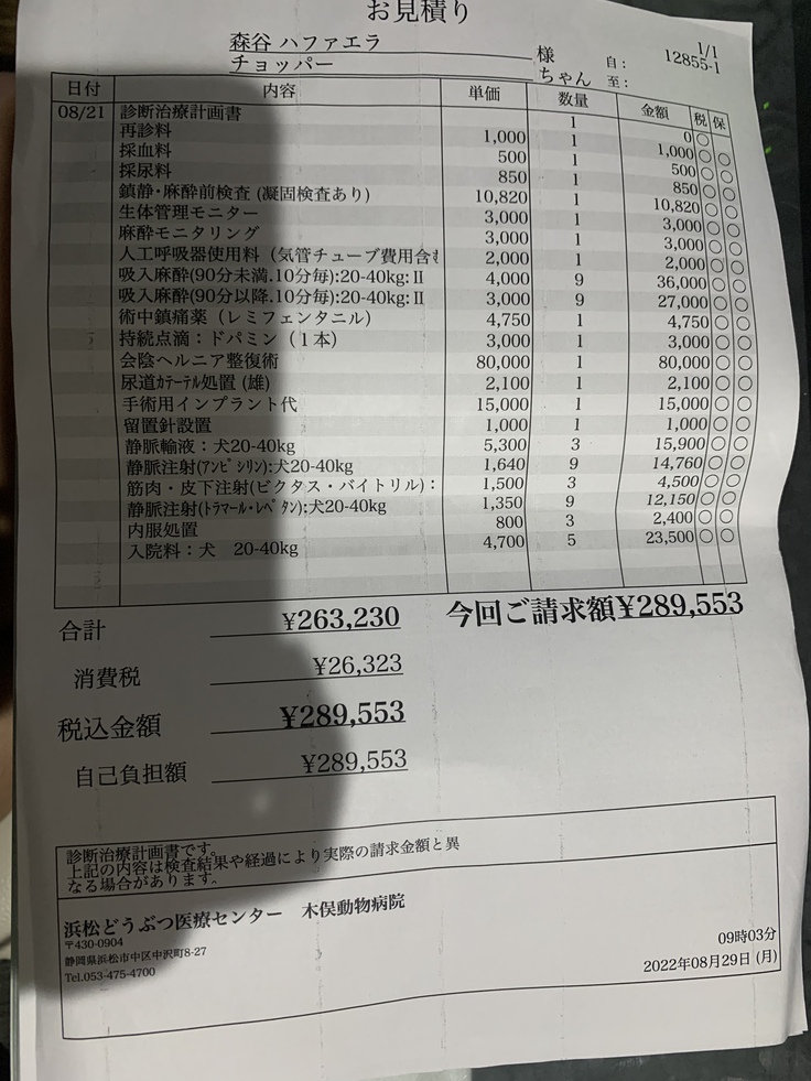 今回チョッパー君の手術費用がおよそこれくらいになります。