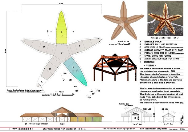 ニュースなどで目にする機会はほとんどなくなってしまったかもしれませんが、バヌアツはまだまだ大変な状況が続いています。日本でも災害によって多くの被害が出ていますが、今だからこそ助け合うことが必要だと考えています。一級建築士である南俊治氏[南俊治建築研究所]が南太平洋の気候や風土、土地柄に合うように、ヒトデのデザインの施設を創案してくださいました。