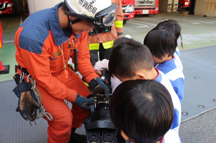 キラキラした目で消防士さん達をじーっと見つめしっかりお話を聞いていました。