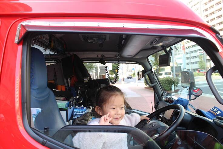 消防車に乗ってみたり、色んな道具を持ってみたり…