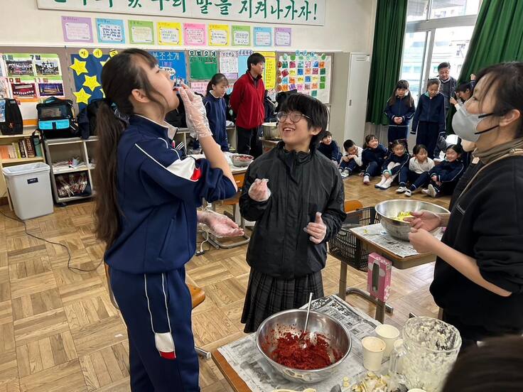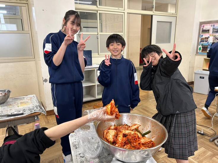 生徒たちは慣れない事に戸惑いながらも教わった事を丁寧に行い、とても美味しいキムチが出来上がりました。