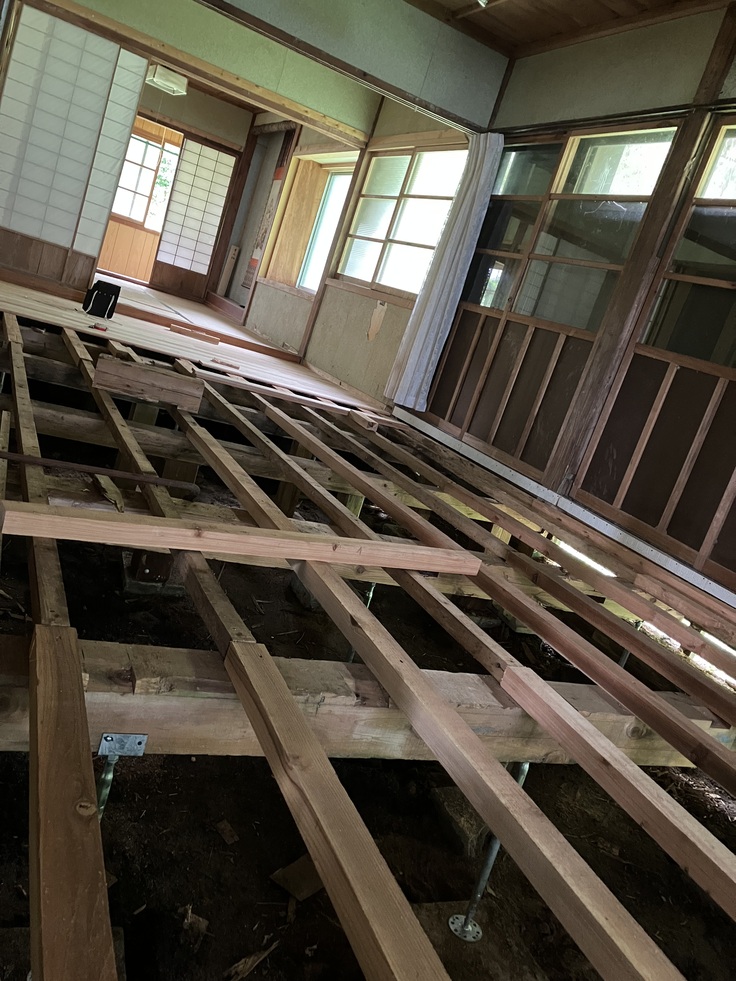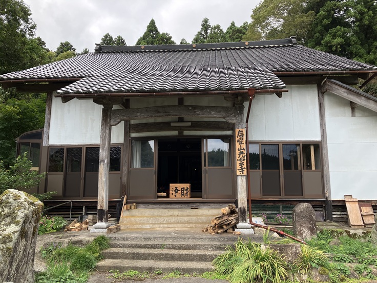 光雲寺は天正年間創建の浄土真宗の寺で、七尾の郊外の田畑や杉林を見渡せる小さな村落の中にあります。5年前から本堂は使われておらず、2年前最後の老住職、90代の女性でしたが、その方が亡くなってから廃寺となっていました。今年6月に寺に入ってからずっと、老師は前住職らの膨大な生活ゴミや不用品を捨てたり掃除したり、敷地を草刈りしたり畑を作ったりして、どうにか住めるようにはなりました。しかし本堂も住居の方も、湿気と経年劣化によって床はボコボコへこみ、屋根の瓦は落ちている箇所があり、現在も全体的に大規模に修繕が必要な状況です。老師は山暮らしの経験から、自ら木材を買い、電動ノコギリを駆使して土台と床を新しく張り始めました。