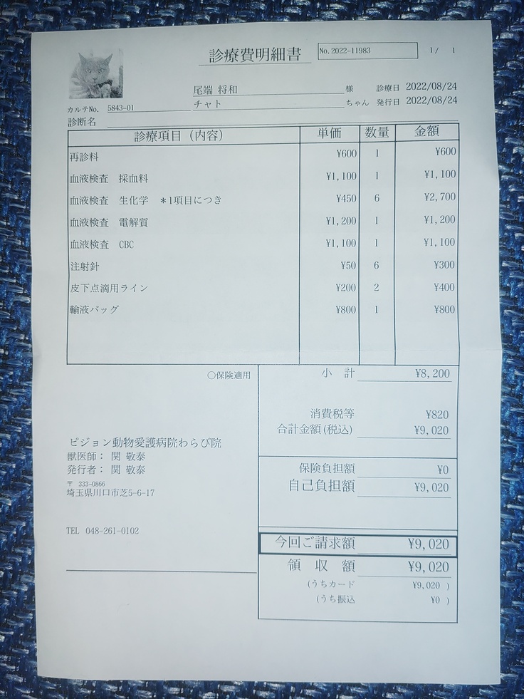 ↓体調が急変し病院で診察した明細です。この時、入院させることを勧められましたが、一旦保留にしました。