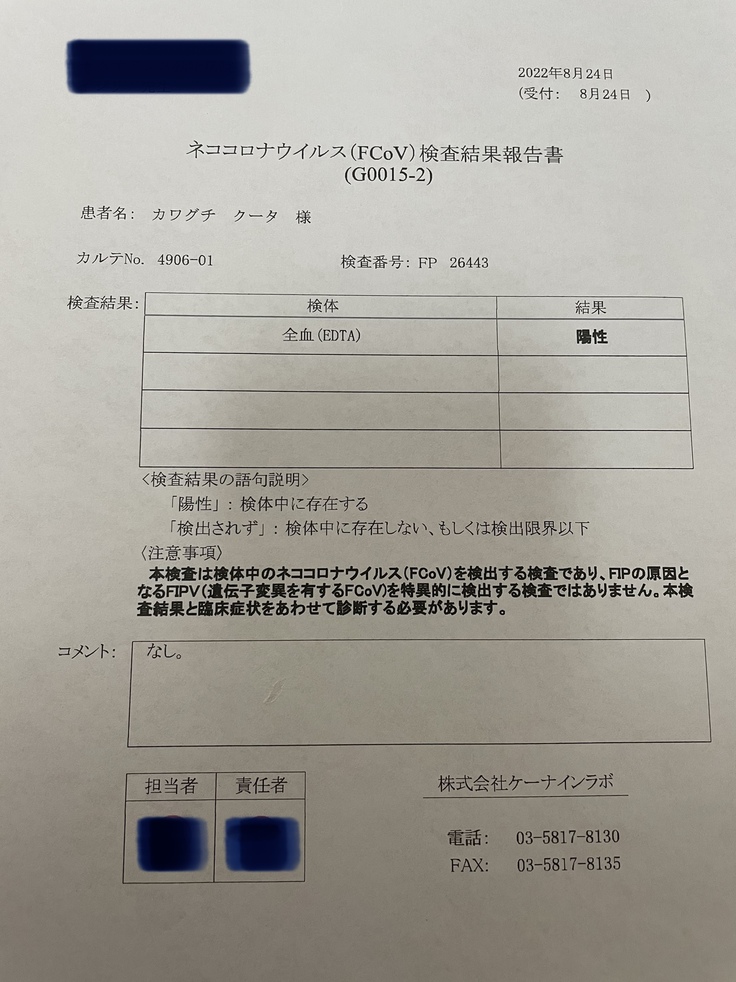 FIP治療できる動物病院へ二度目の通院。FIPの検査の結果陽性で混合タイプでした。血液検査の結果ほとんどの数値は良くなっていました。