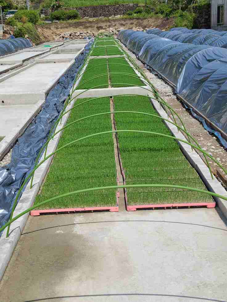 この施設に本社より播種を終えた苗箱を運んできて、プールに並べ寒さ対策のドームを被せて育てます。5cmほどに育ったらドームを外しプールに水を入れたりしながら田植まで待ちます