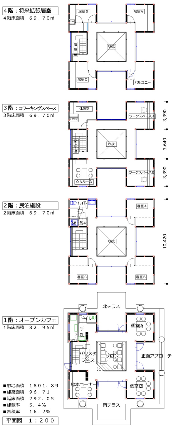 この4階建てのビルは、オープンテラスカフェ、民泊施設、ワーケーションなどに対応可能なコワーキングスペースで構成される複合ビルです。4層吹抜けの木造一体空間に各機能が付属した形で構成され、施設運用の状況に応じた入替や追加増減などに柔軟に対応可能なシステムとなっています。