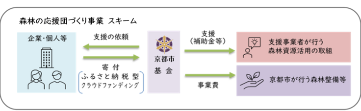 本プロジェクトは、森林資源の活用を通じて、健全な森づくりにつながるとともに、社会課題の解決や地域の振興に資するものとして京都市が認定した民間事業者の取組を、ふるさと納税制度を活用し、御賛同いただける方から寄付を募り支援するものです。