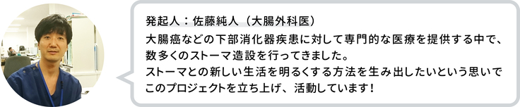 大腸外科医 佐藤純人がプロジェクト発起人として、東京デザインプレックス研究所、横浜市立大学 先端医科学研究センター コミュニケーション・デザイン・センター(YCU-CDC)、コロプラスト株式会社、凸版印刷株式会社とチームを組んで進めています。