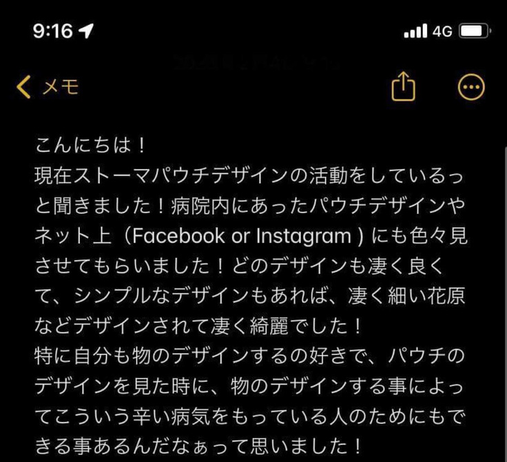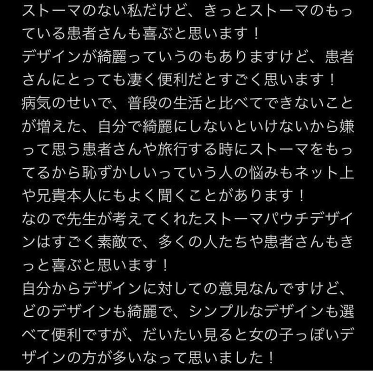 デザインストーマパウチプロジェクトです。オストメイトの方のご家族から大変温かいコメントを頂きました!このクラウドファンディングもあと少しとなりました。オストメイトの方、そのご家族の方、そしてご支援してくださった方の思いと期待に添えるように頑張ってまいります!