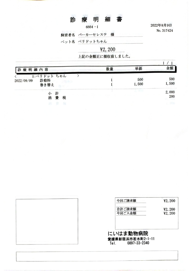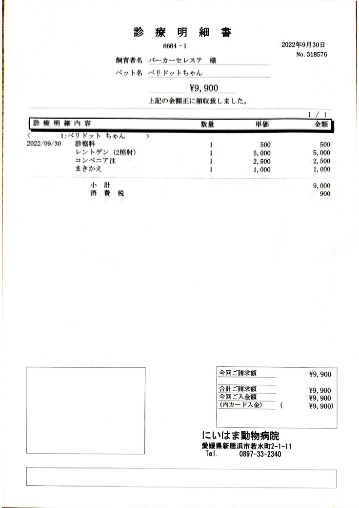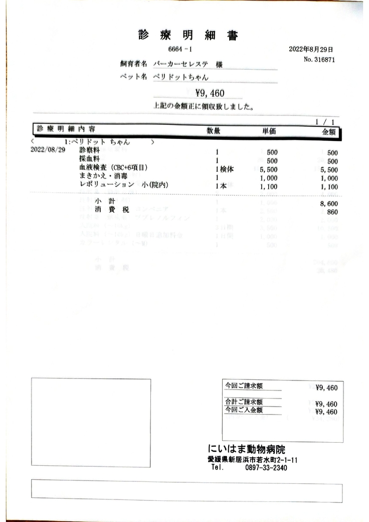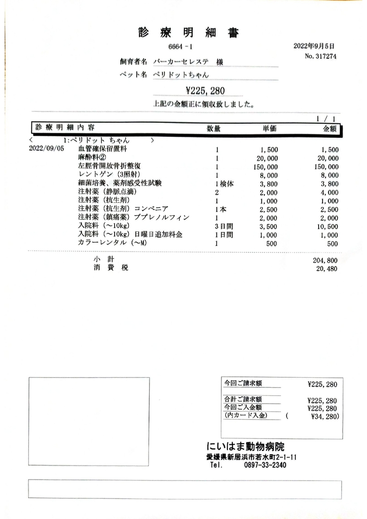 ペリドットがこれから成長していくうえでの、養育資金の寄付をお願いしたいと思っております。(今回治療に当たり、このような金額がかかりました)