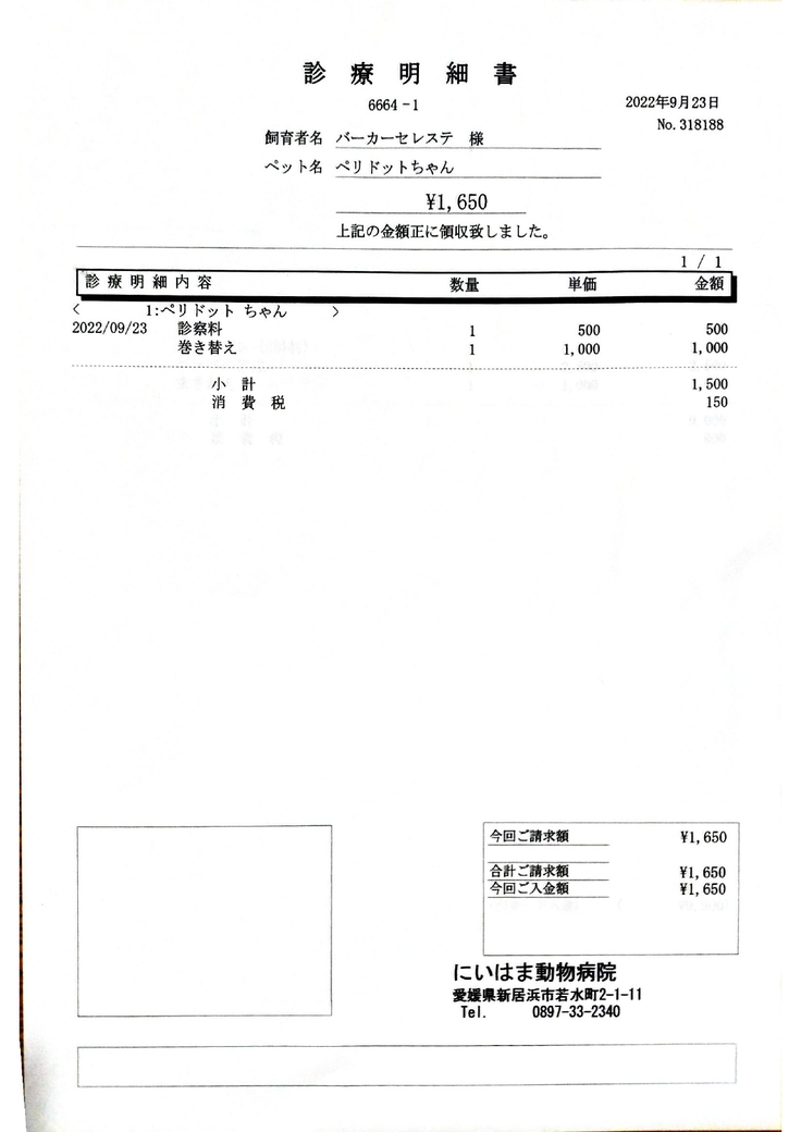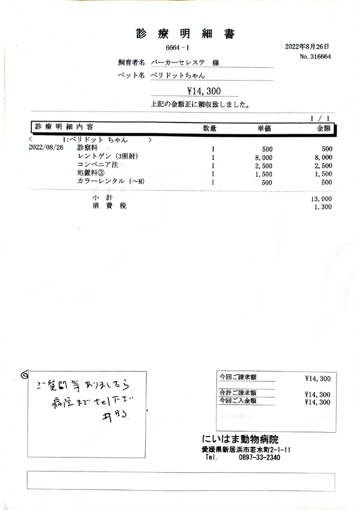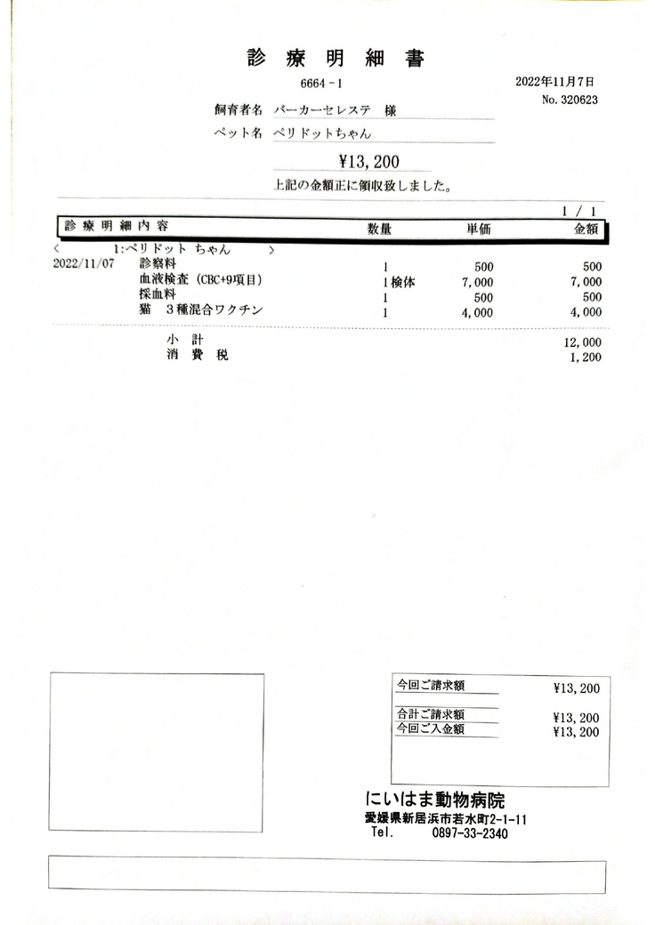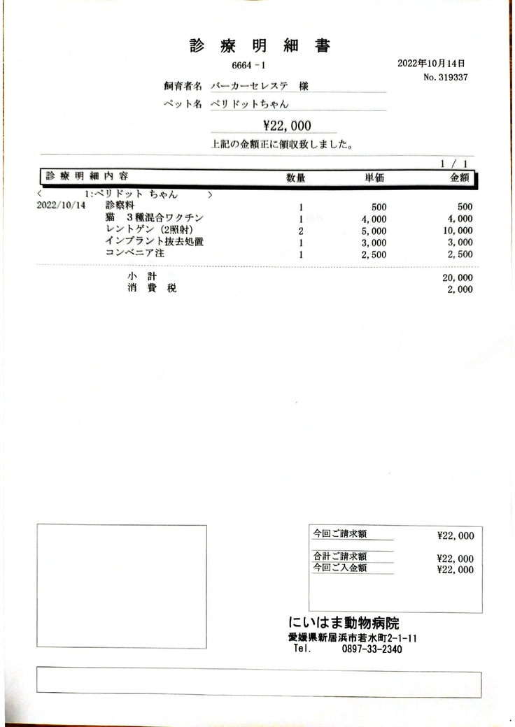 ペリドットがこれから成長していくうえでの、養育資金の寄付をお願いしたいと思っております。(今回治療に当たり、このような金額がかかりました)