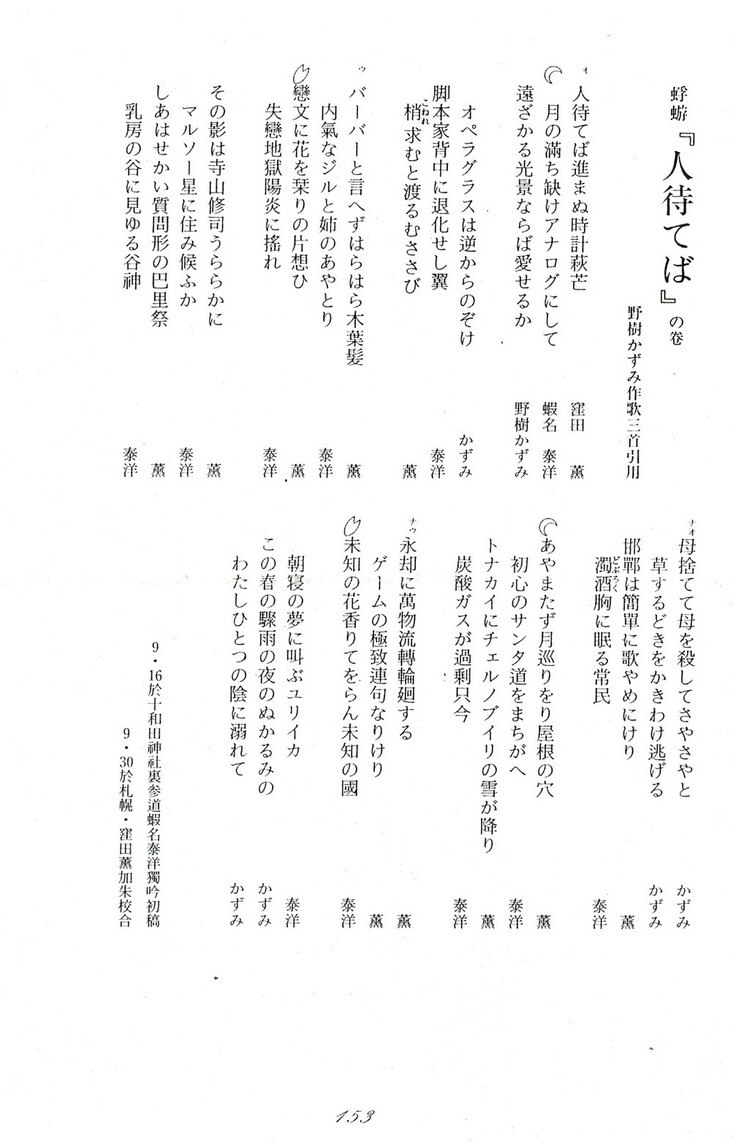 私は長い間ずっと忘れていたんだけれど、蝦名さんからの最初の手紙(1990年10月)は、野樹の歌を連句に引用したから許可ください、という内容でした。その連句のコピー発見したので、貼っておきます。(手紙には草稿が同封されていました。その後、同人誌か何かに載せたのでしょう、ページがあるから)