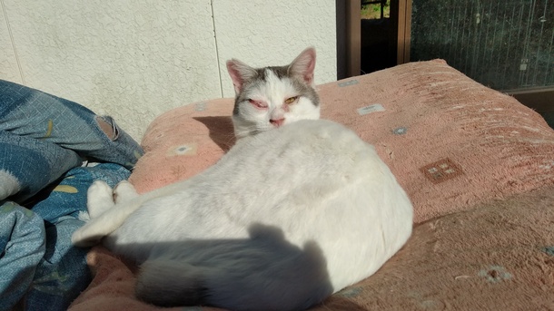 チビラ君は、視力は、ないが、まるで見えているように高いところも乗るし、トイレもわかっている。のんきそうだけど、よく人の行動を気にしているみたいだ。