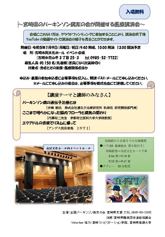 全国パーキンソン病友の会 宮崎県支部がパーキンソン病医療講演会を企画・開催する。その必要実行資金として50万円(講演料、会場費、パンフレット作製配布、等)。なお、企画・準備および当日の運営はボランティアにて対応。講演会実施日は2023年1月9日。その後、リターンの会報誌や動画配信などの準備を2月末までに行う。