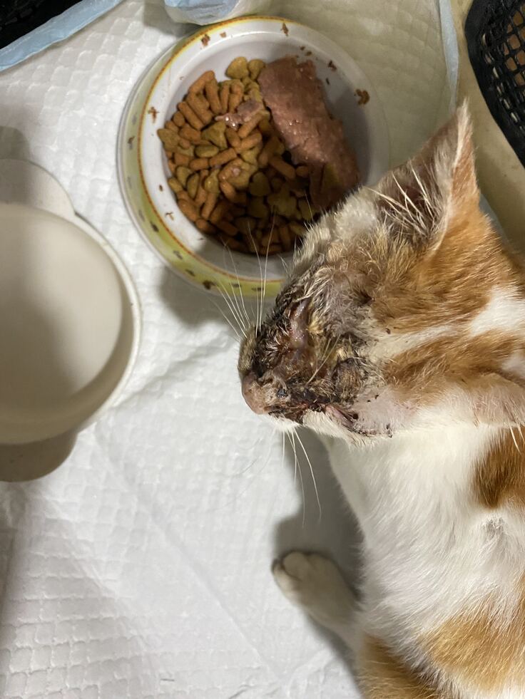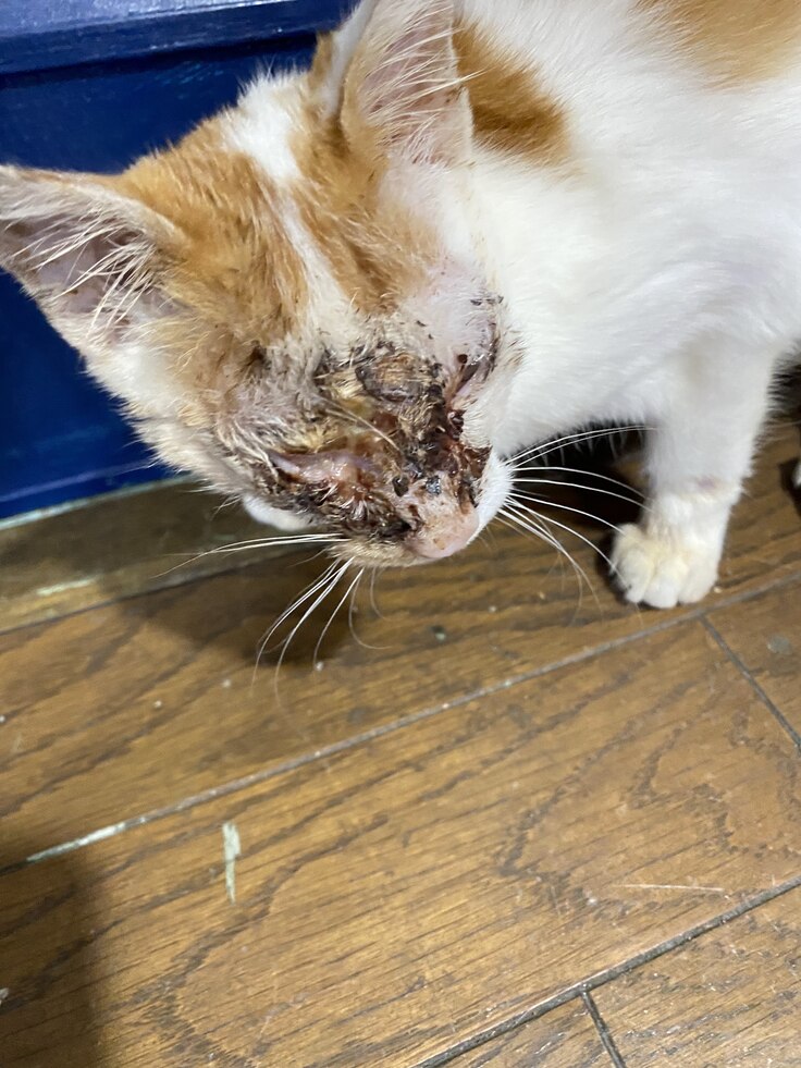茶白の保護猫。瘡蓋のようなものが剥がれたと思ったのですが、