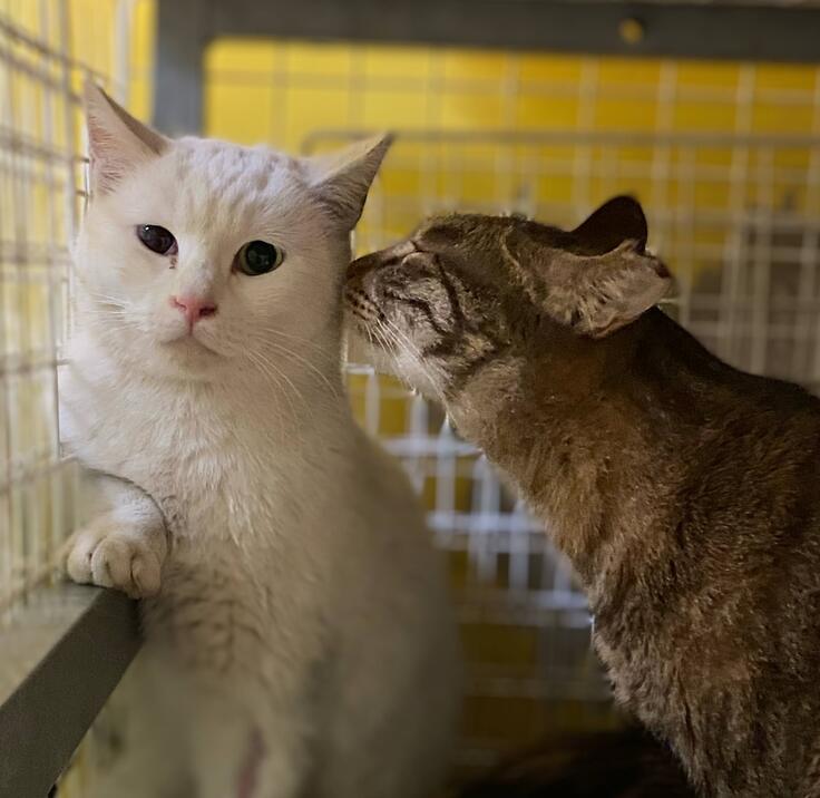 先輩猫ちゃんが優しく近寄り、フォローをしてくれます。