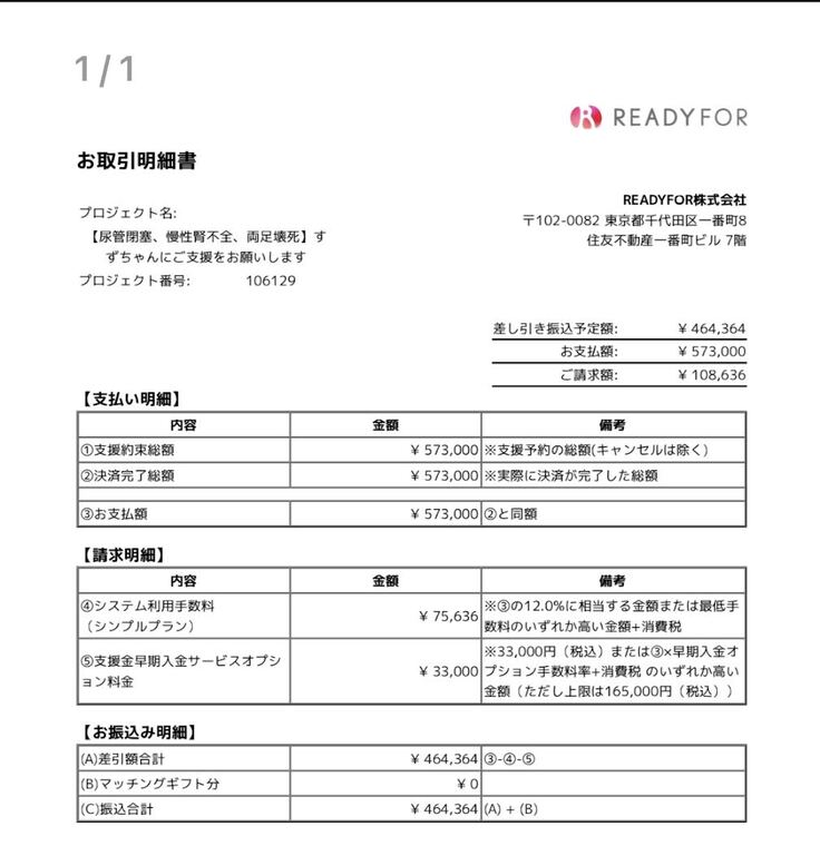 上記の手数料などを支援総額から差し引きした振込金額 ¥464,364