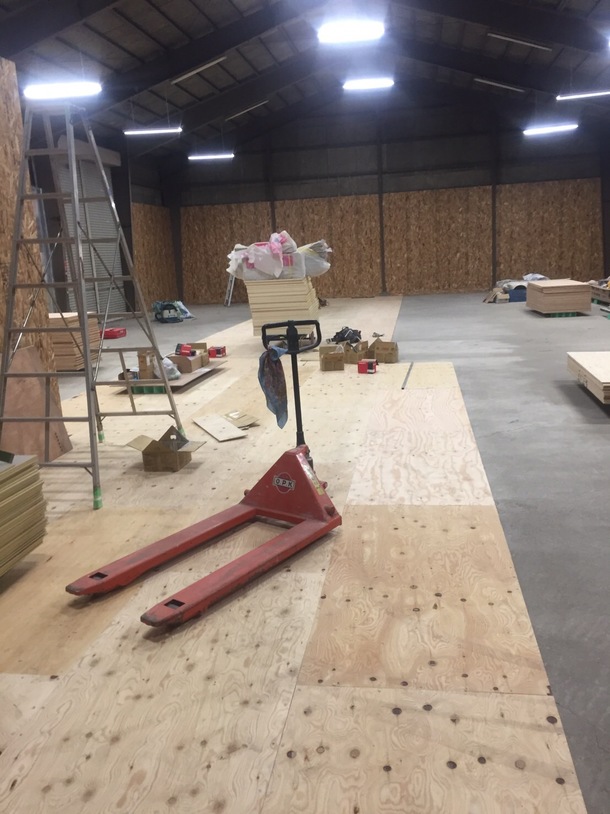 床面のコンクリートに厚いベニヤを打ち付けて床面を造っていただきました。