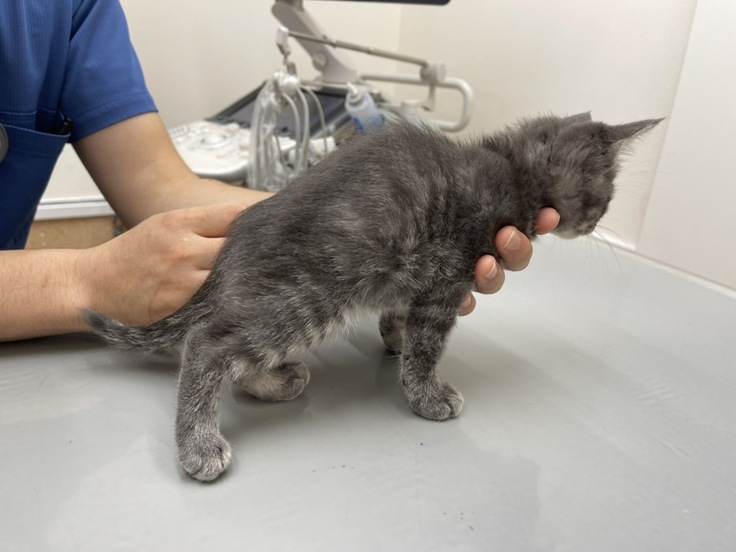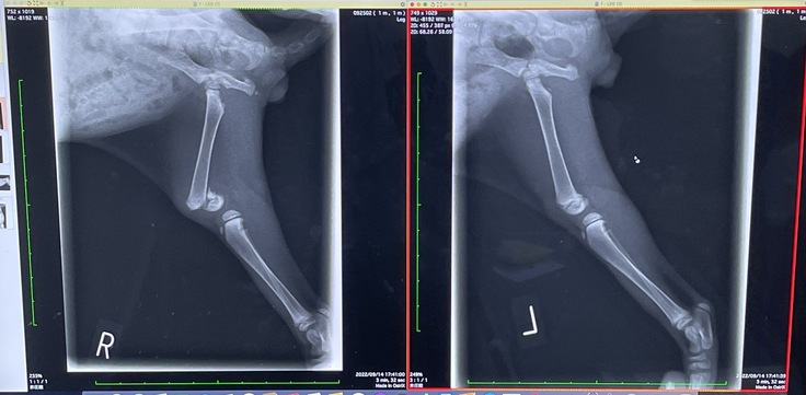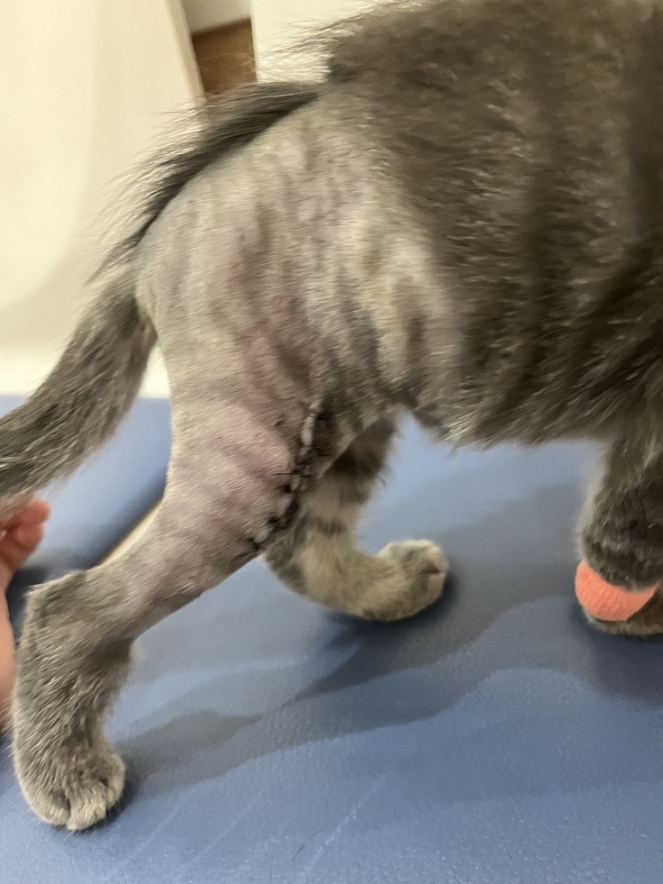 後ろ足に違和感があることに気が付きそのまま、動物病院に駆け込みました。
