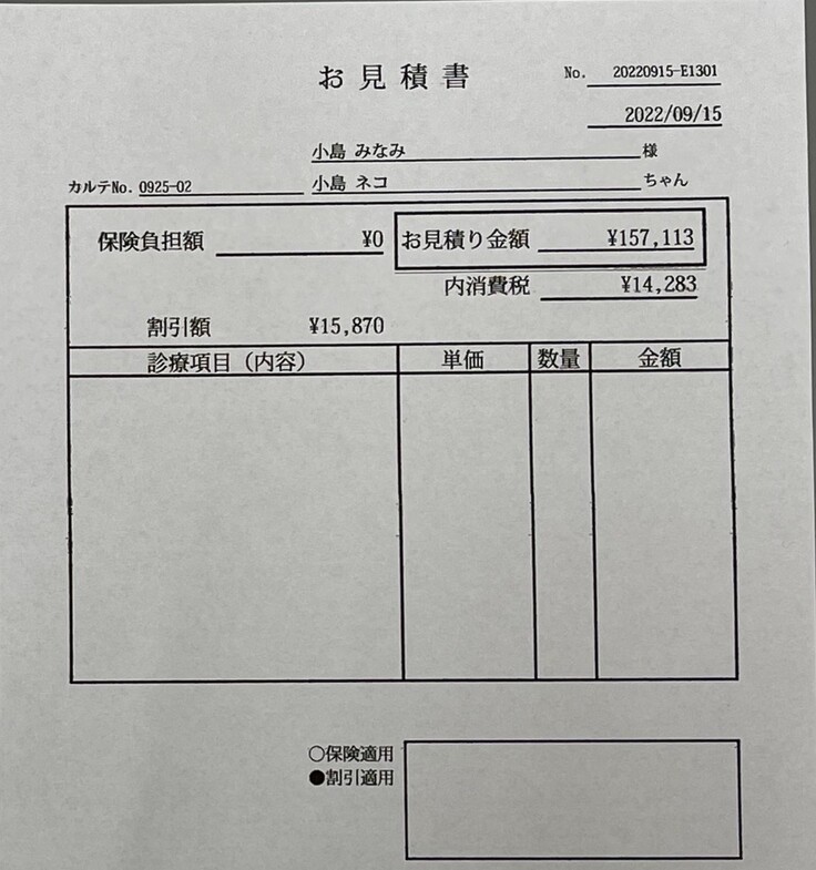 (病院名は伏せさせていただきます。動物病院から掲載許可を得ています。)