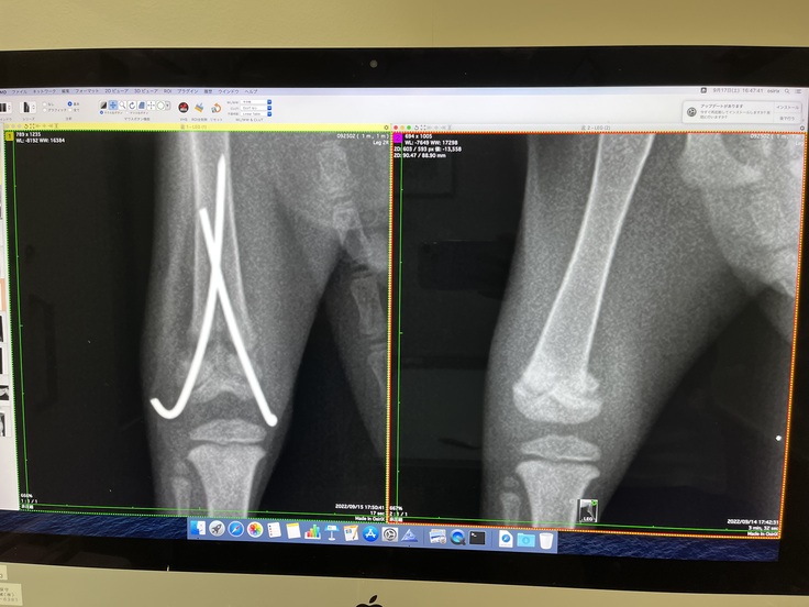 右大腿骨骨折部分にクロスピンを入れて元の位置に戻す手術を行いました。