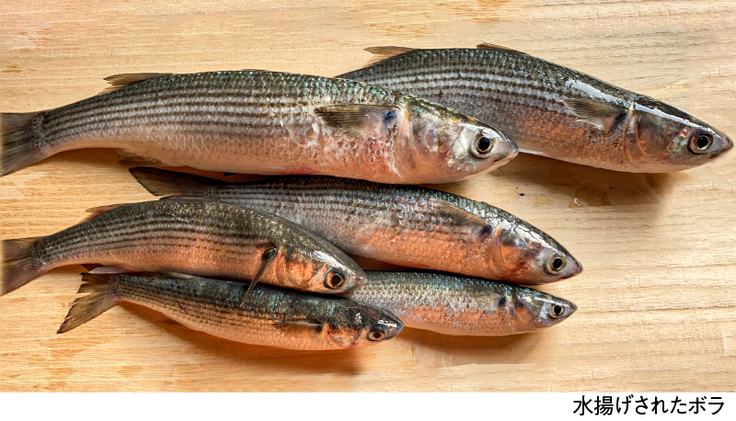 原料となるボラの漁獲量と、それを加工したカラスミの生産量には大きな差が生じます。これはメスの卵のみが原料となるため、漁獲量の約90%を占めるオスを除いた10%のメスの内、卵の有無、卵のサイズ、さらには手間ひまのかかる加工によるロスなどで、その半分以上が商品として販売することはできず、最終的に商品としてカラスミになるのは漁獲量全体の僅か3~4%と言われています。つまり、100匹獲れたとしても4本しかカラスミが作れないということです。