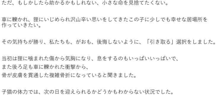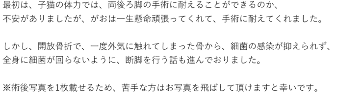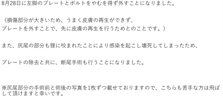 そのため、クラウドファンディング残りの期間で次回の手術代分をネクストゴールで目指していきたいと考えております。
