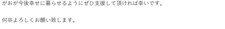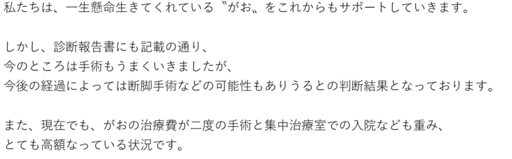 ご支援いただきました費用につきまして、今までかかってきた治療費に充てさせていただきます。本当にあたたかい応援をありがとうございました。