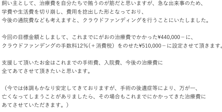 金額としまして、第1ゴールの510,000円に、今回の手術代にREADYFORでの手数料12%を含めた85,000円をプラスし、合計595,000円を目指していきます。