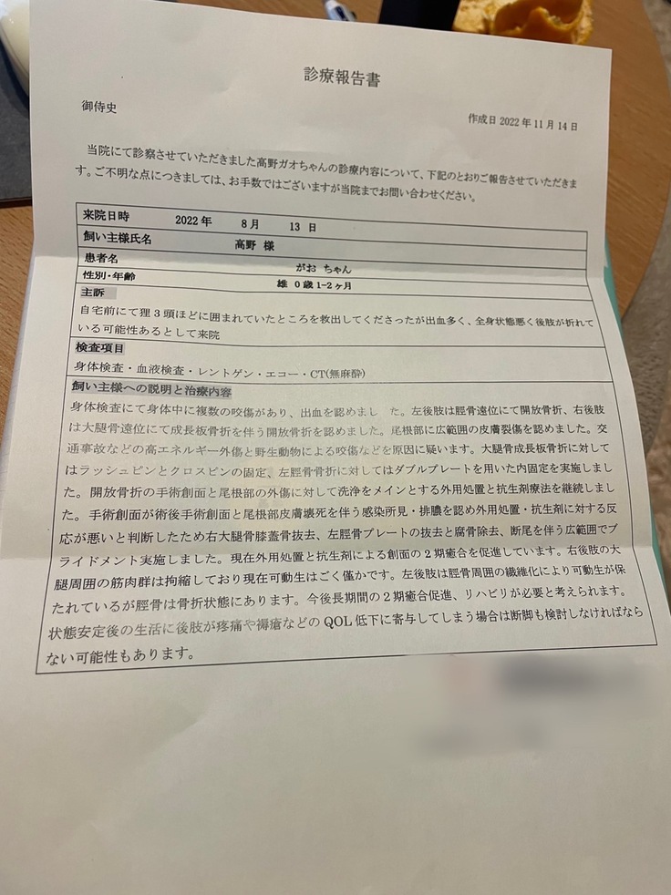 写真などで現状報告をさせていただきます。 がおのこれまでかかった治療費と今後の治療費にもあてさせていただきます。
