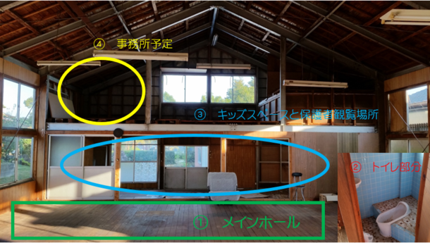 そこで、メインホール横の部屋を、小さなお子様が遊べるキッズスペースと保護者様がゆっくとくつろぎ、見学できるスペースを合わせた場所にリフォームしたいと思っております。