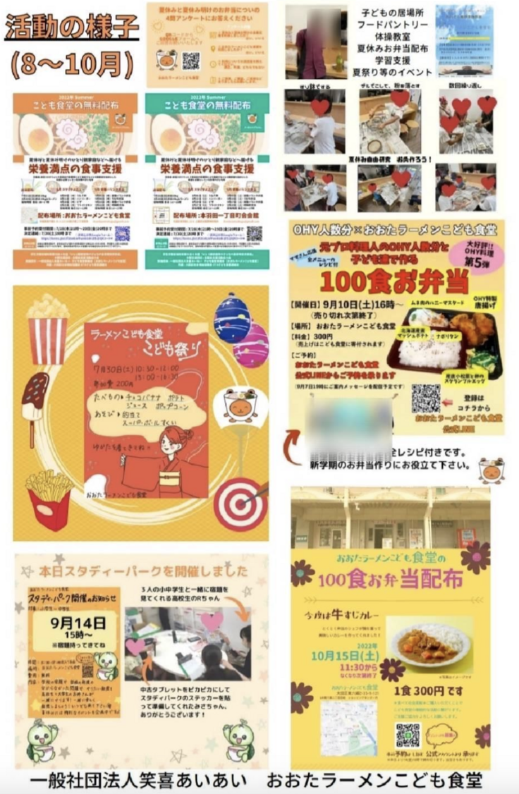 活動内容としては、フードパントリーで、食材やお弁当を中心とした物資の配布をしたり、学習支援(スタディパーク)では、学校の宿題など分からないところを地元の高校生達を中心に教え合いを行ったり子供料理教室や工作、ゴミ拾い、駄菓子屋さんなど様々なイベントを開催したり地域密着の取り組みをしております。