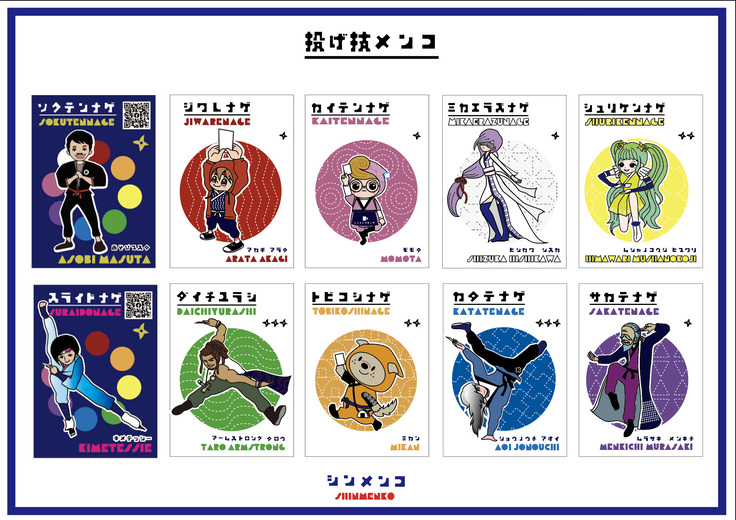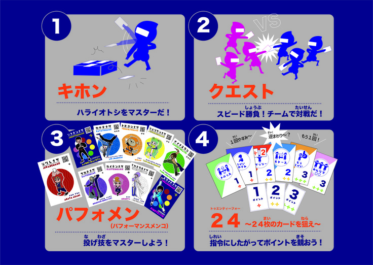 シンメンコには、新しい10通りの投げ技を得意技とする「キャラクター」がいます。 この投げ技を練習する子どもたちの姿を見て、キャラクターをつくろうということになりまし た。 投げ技を練習するイメージが、修行する忍者のイメージと重なり、キャラクターは忍者に決定! 投げ技のイメージからキャラクターをつくり、それぞれのプロフィール、ストーリーを考えました。忍者たちがメンコバトルをしながら仲間に出会うストーリーが、「シンメンコ」での遊びを 盛り上げます。
