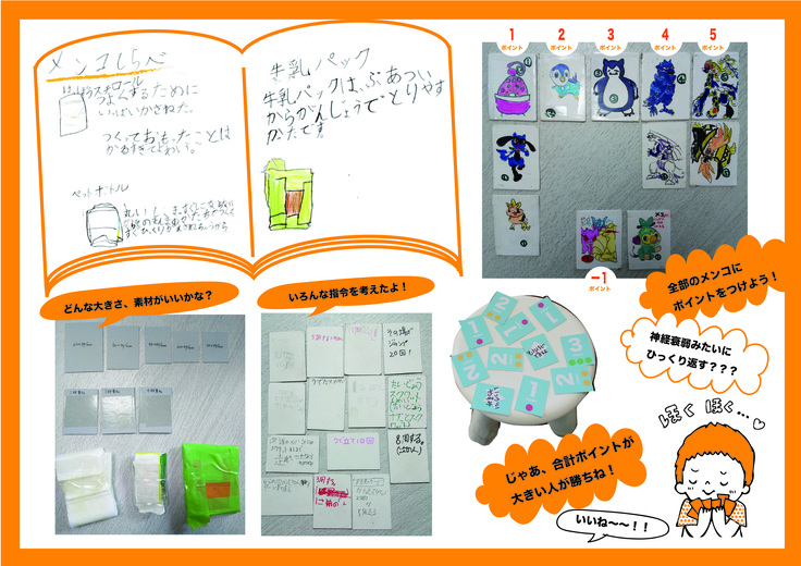 ルール④24(トゥエンティフォー)…子どもたちのアイディア(もう一回投げられるなど)を詰 め込んだ指令カードを使ったルールです。払い落とす楽しさに加え、指令をクリアしながら多くの得点をゲットした人の勝ちです。 ※子どもたちにどんどんおもしろい指令を考えて欲しいと、「なんでもメンコ(自分で好きな指 令が書けるメンコ札)」もつくりました。