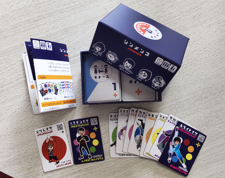 リーダー青木が当時6歳だった息子と手作りのメンコで遊ぶ中で、「メンコに点数を付け、ゲットしたメンコの点数を競う」という新しいルールが生まれました。 メンコを裏にして順番に落としていくルールです。 思いつきそうで思いつかなかったので、青木は目からウロコでした! 子どものアイデアってすごい。