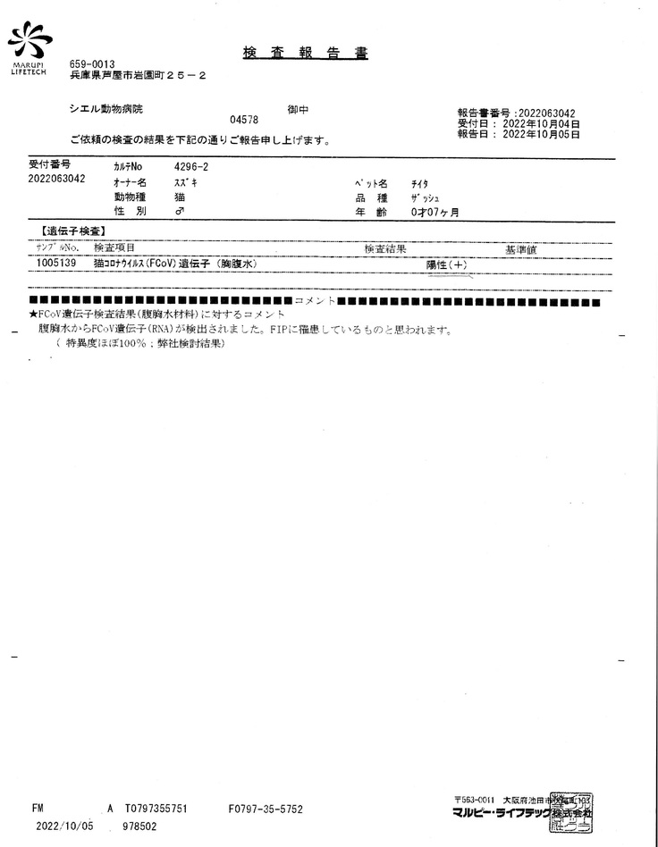 本来は0~6程度ですが、ちい太は150以上もありました。強い炎症反応が出ているのでFIPとみて間違いなく、危ない状態だと告げられました。