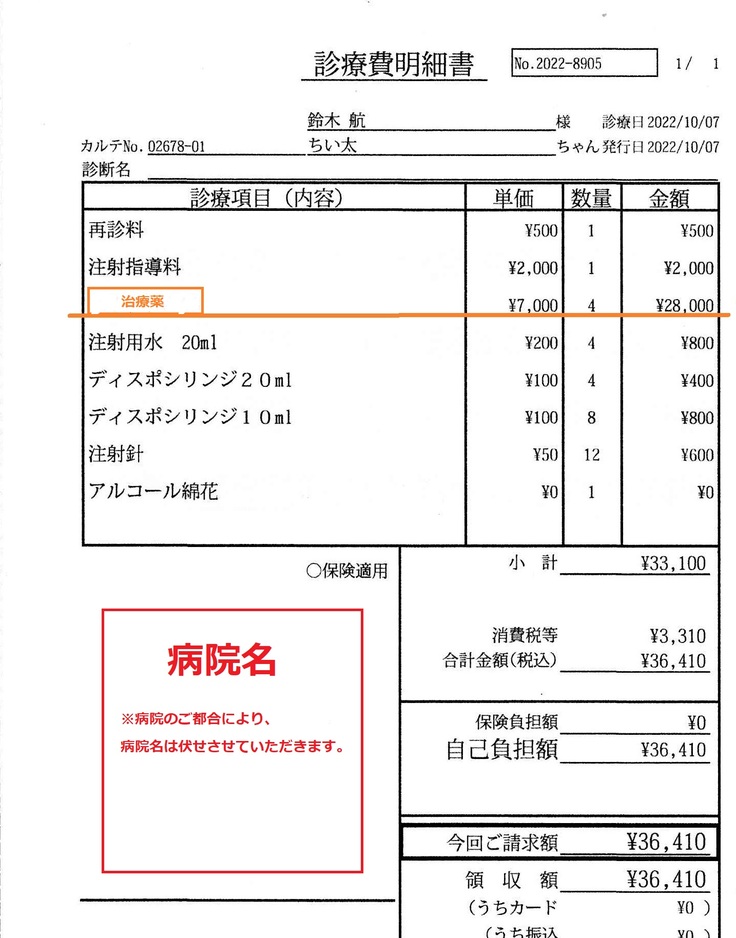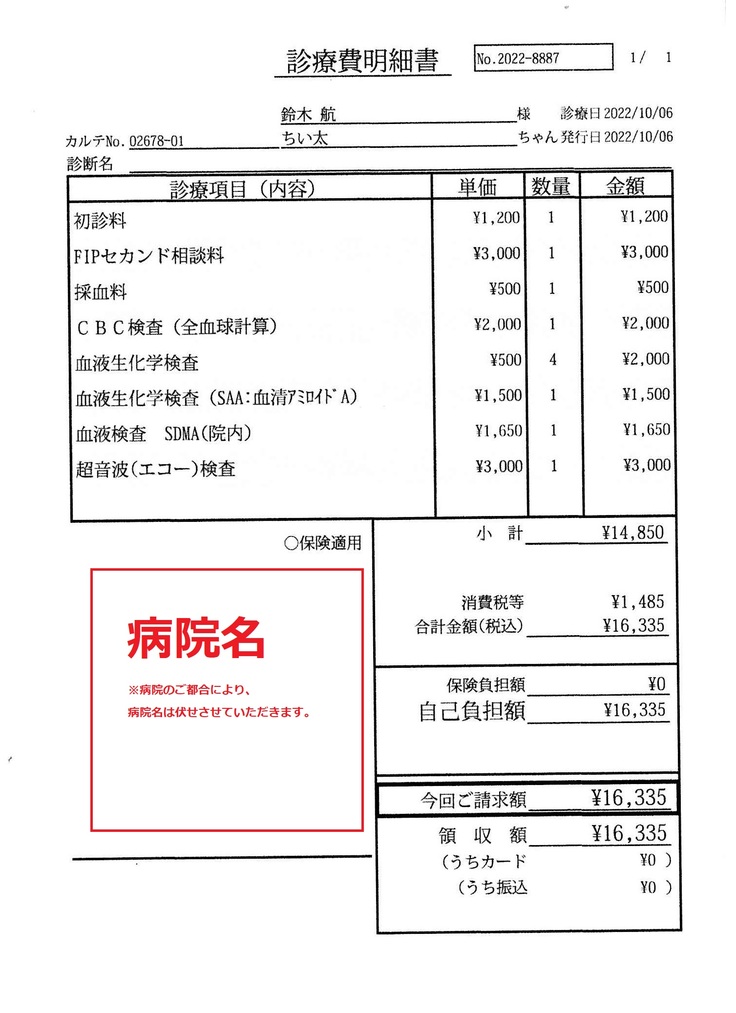 FIPの治療は国内未承認の輸入薬を用いるため高額です。保険も適用されません。