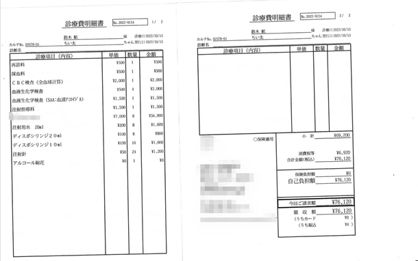 検査代・2週間分の薬品代・注射器や注射用水などの消耗品を合わせて76,120円。