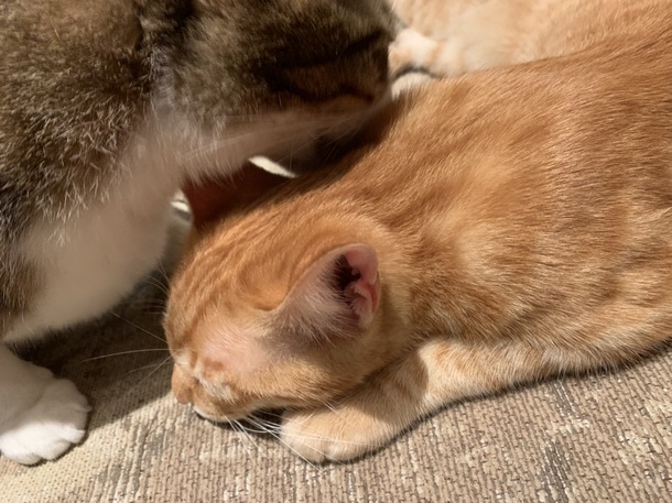 ちい太が鳴けば2階から降りてきて、よく毛づくろいをしてあげています。
