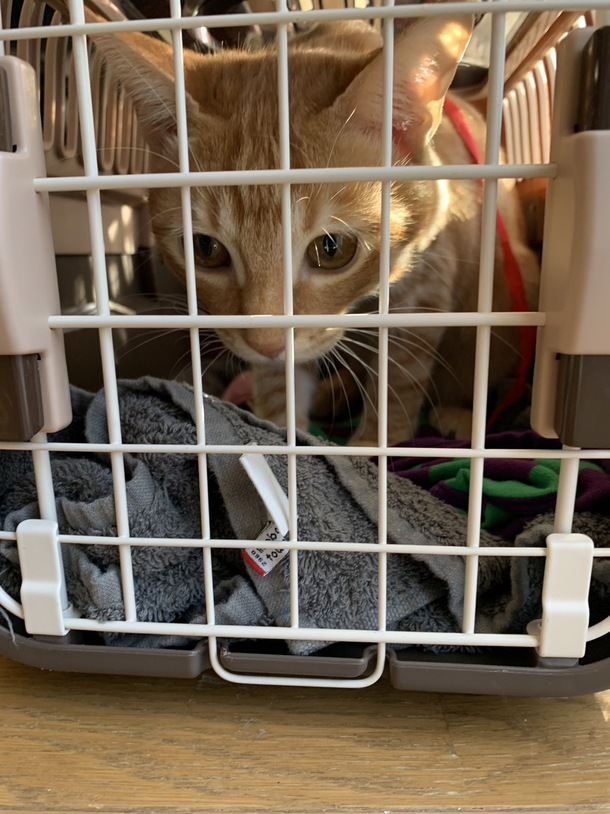 病院のことは忘れて楽しく過ごしていたのに、ゲージに入れられて思い出したのでしょうか、不安げな表情です。