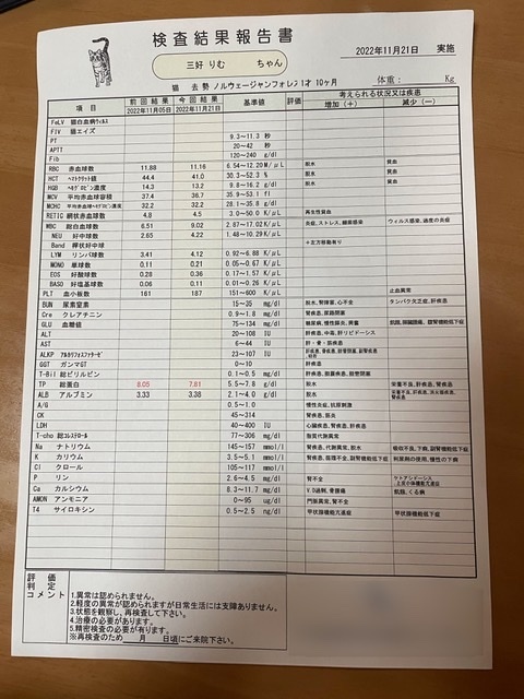 血液検査:総蛋白も基準値内0.1オーバーもこのくらいなら問題ないでしょうとのこと。