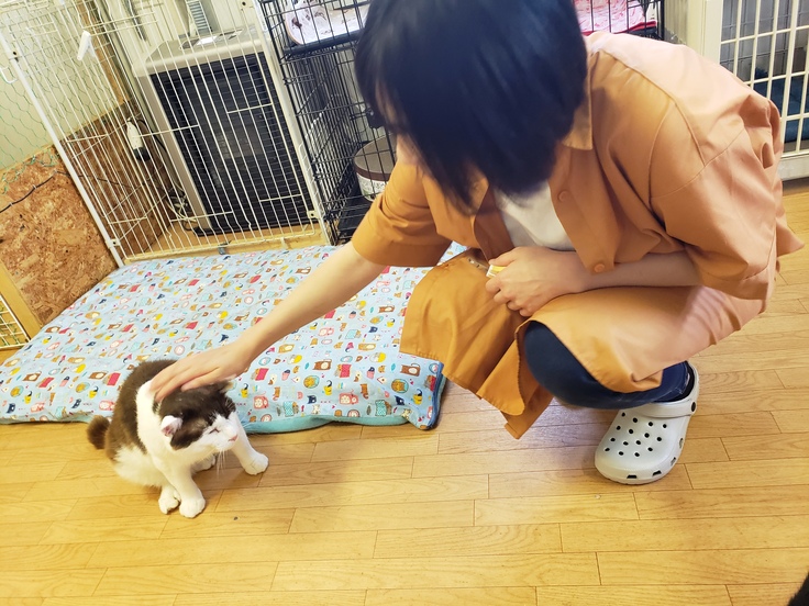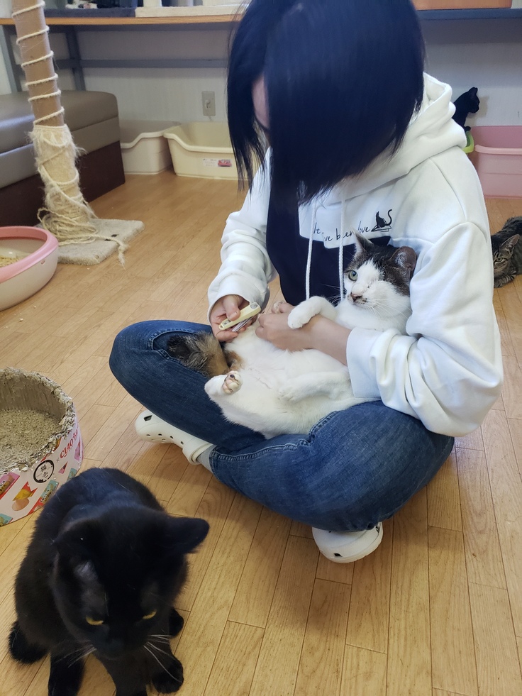 到着後施設を紹介し、動物病院の打ち合わせをした後、休む間もなくスタッフの皆様がふれあい広場の猫ちゃん達の爪切りを行ってくれました‼