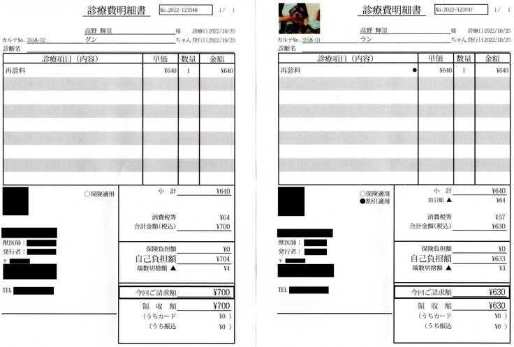 《診療費明細書・薬やサプリメントは2匹まとめて処方》