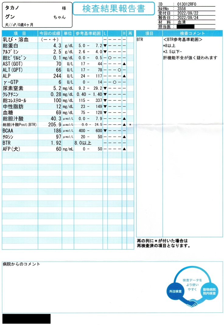 これまで1ヶ月ごとの血液検査で経過観察を行い、食事は、特別食=肝臓サポート、投薬、サプリメントを毎食服用していました。