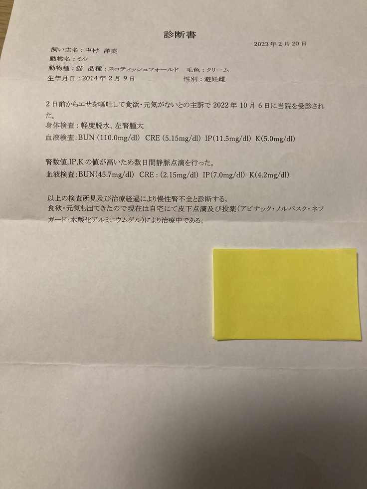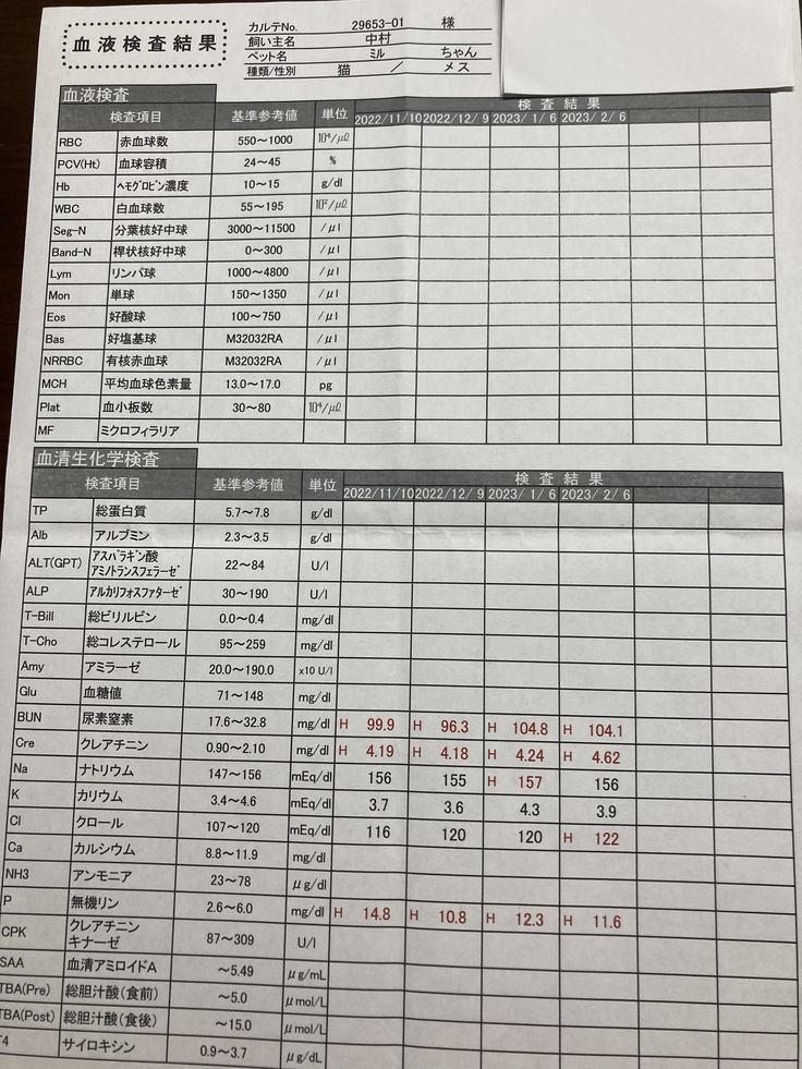 9歳になる愛猫(ミル 女の子)が2022年10月に食欲がなく病院に連れていったら慢性腎不全との診断受けました。その日より入院、3日程で数値が少し下がったので毎日の通院になりました。皮下点滴は本人にストレスもあり在宅点滴に変更し定期的な採血をしています。2月20日現在の状況は前回の結果が悪かったため毎日200mlの皮下輸液、服薬3種類となっています(リンの吸着薬.腎臓の機能を助ける薬.活性炭)2/6血液検査の値はほぼ前回とは変わりませんが引き続き同様の治療行ってます。食事があまり食べれなく毎日の点滴もストレスを与えていると思いますがほかの選択肢がないため飼い主も本人も頑張って治療を続けたいと思ってます。またこの病気は多飲多尿のため猫砂、ペットシーツが大量にいる事になりました。どうかよろしくお願いします。