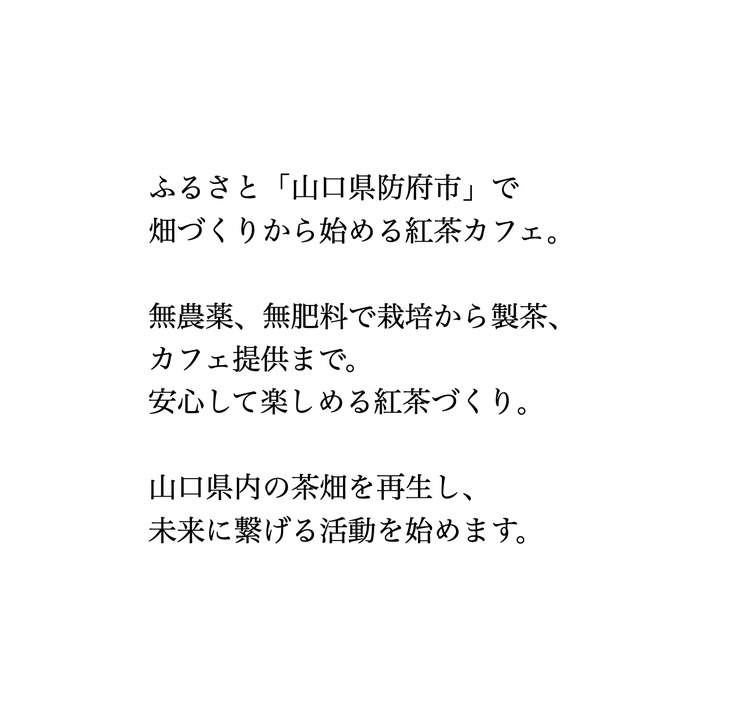 山口県周南市の高瀬町、宇部市小野地区にある茶畑の管理から紅茶茶葉の生産、提供するカフェを作ります。