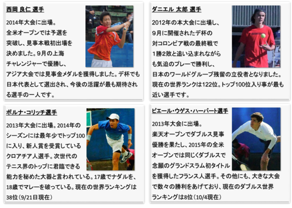 男子のチャレンジャー大会を開催した2007年には、世界ランキングトップ100位にランクインしている日本人男子選手はいませんでした。しかし、現在では初年度より毎回出場して下さっている添田豪選手を初め、伊藤竜馬選手や杉田祐一選手、西岡良仁選手等多くの日本人選手がキャリアハイでトップ100位入りを果たしています。ダニエル太郎選手が、昨年の慶應チャレンジャーで優勝したことで自身キャリア初のトップ100位入りした事は記憶に新しいのではないでしょうか。