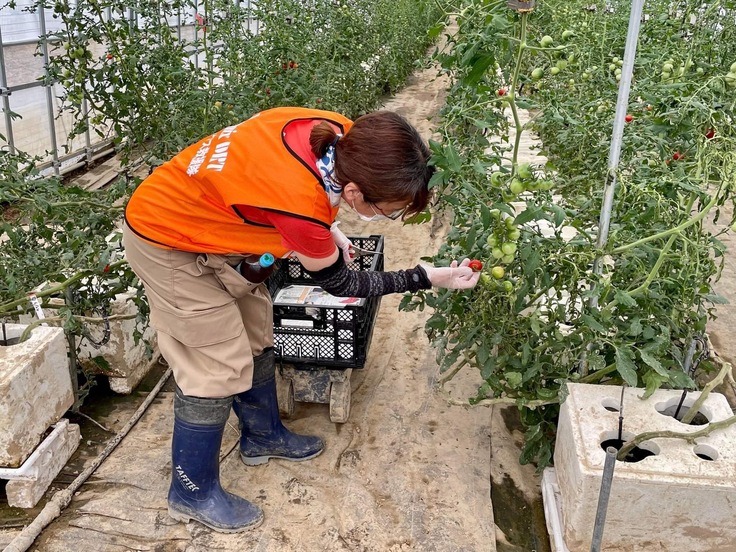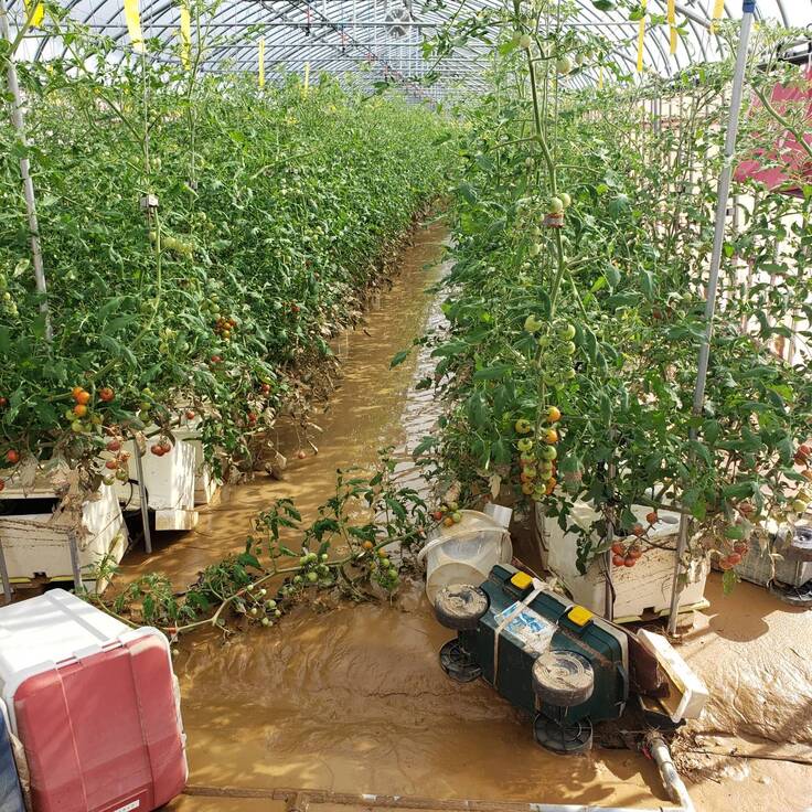 栽培ハウス内に流れ込んだ大量の土砂で、収穫を待つ真っ赤なトマトたちが放置され、トマト栽培に欠かせない整枝作業も手付かずです。